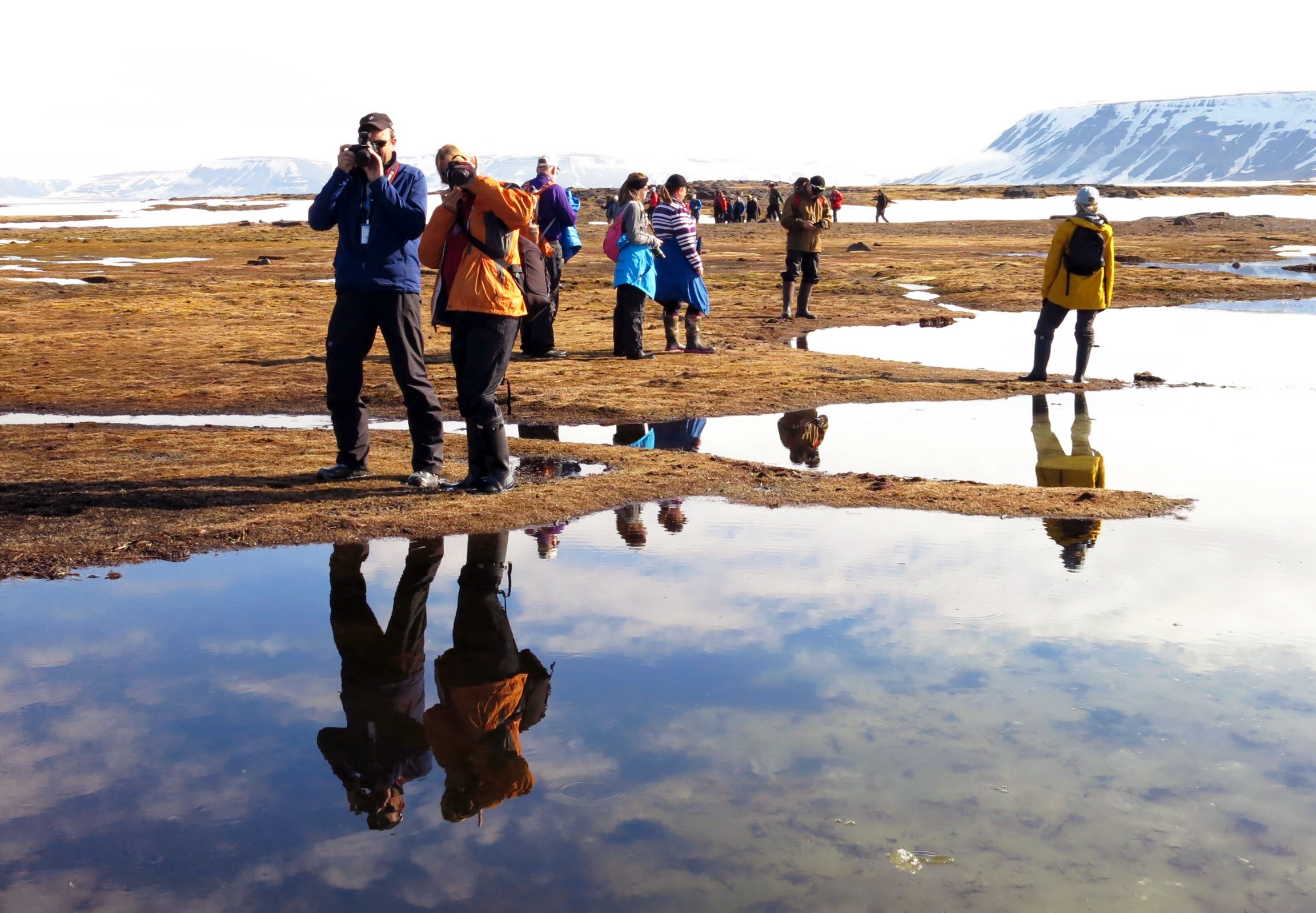 Over breakfast we enjoyed the fantastic views, especially after yesterday’s fog. After a short boat ride, we are all ashore on the flat tundra landscape with rock outcrops and snow fields. Guests had a few different hike options today, from a short stroll along the water to a longer, more athletic hike that I led – 13 brave souls chose to follow me! After about 30 minutes ashore the sun broke through, making the weather go from good to wonderful! Many of us had to take off several layers of clothing and some even hiked in shorts! (Although this crazy behaviour was only seen in the longest hiking group!)