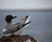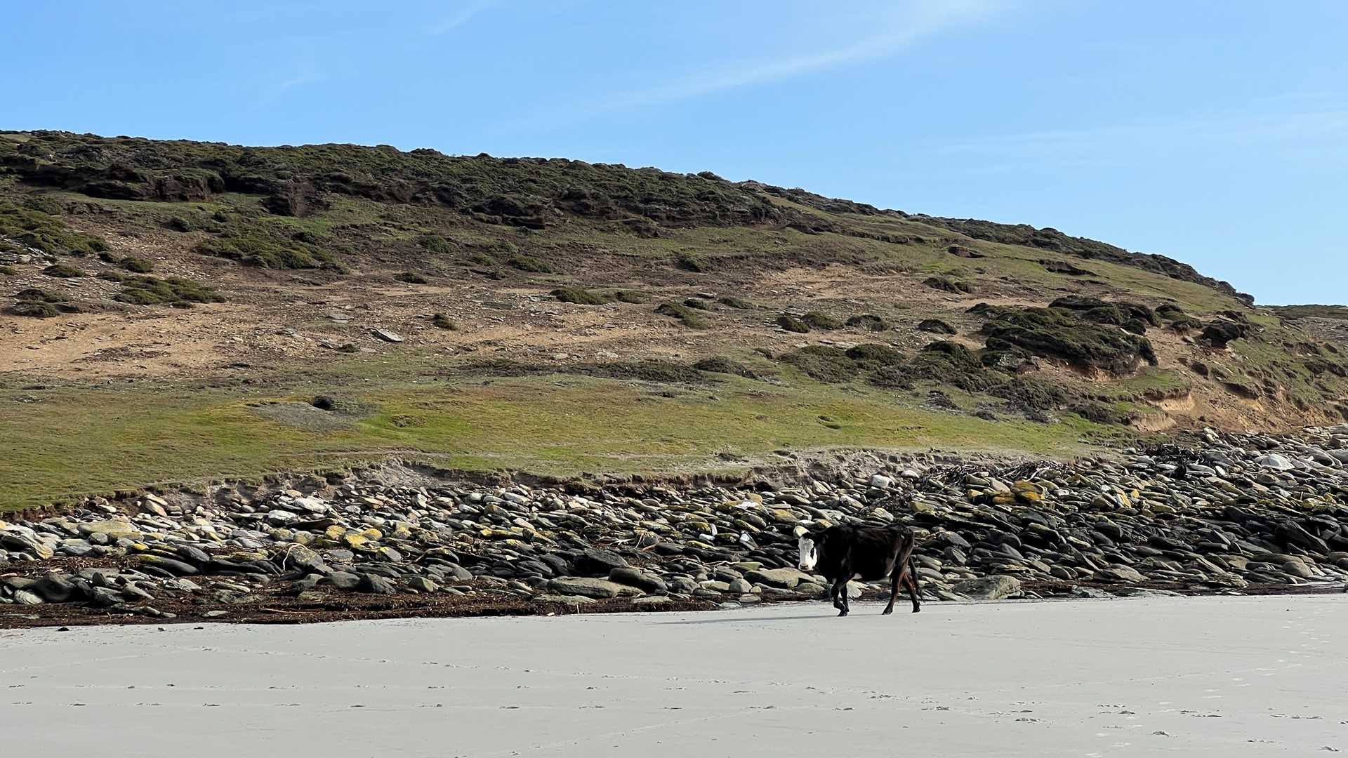 Land Ho! Many of us were grateful to spy land outside of our portholes this morning. The sun was coming up over Saunders Island in the northwest colony of the Falkland Islands. Guests enjoyed the first Zodiac operation of this voyage, which brough them to a long, white beach spotted with sizeable bovines. Just beyond the beach, the grass was home to a comical mixture of sheep and Magellanic penguins. Many guests opted to stretch their legs on the mile-long hike to an impressive black-browed albatross colony that spans the clifftops on the northern part of the island. We maintained a respectful and bio secure distance and enjoyed observing these beautiful animals at rest on their nests built up out of the muddy sediment. Several mature individuals lifted themselves briefly to reveal their incubating treasure, whilst the adolescents were busy practicing courtship, fighting over vacant nests, and seemingly keeping their feet warm as there were no eggs seen in their nests.