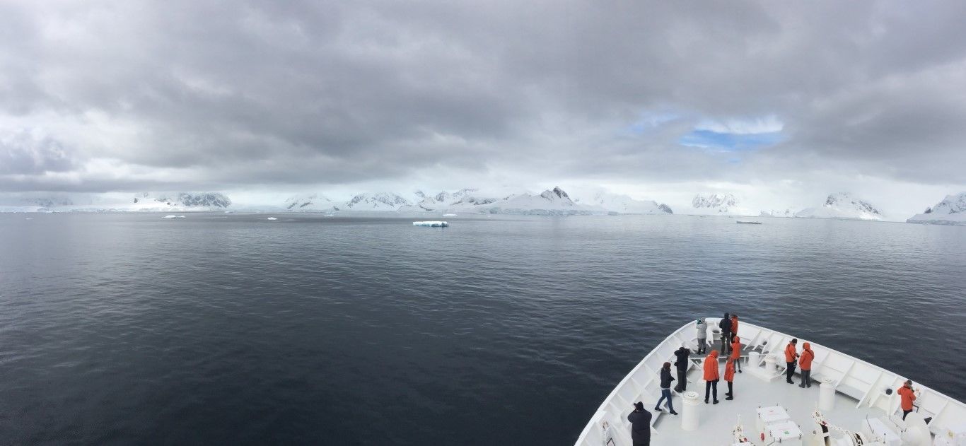 Soon we were crunching through the sea ice towards fast ice at the edge of the bay. The bridge team maneuvered the bow of National Geographic Orion into the ice, causing a couple of crabeater seals dozing nearby to look up with surprise, and arousing interest from a snow petrel. Then we were able to go for a walk on the sea ice, standing on more than 300’ of water under the frozen crust. But oh, the soft snow on top was deep, perfect for snowballs and snow angels, but challenging to plow through if we left the trodden line. The surrounding sea ice was on the move and a return to the ship became a good idea. Leaving this lovely bay, snow started to fall, and a magical seascape of ice and mist slipped away behind us.