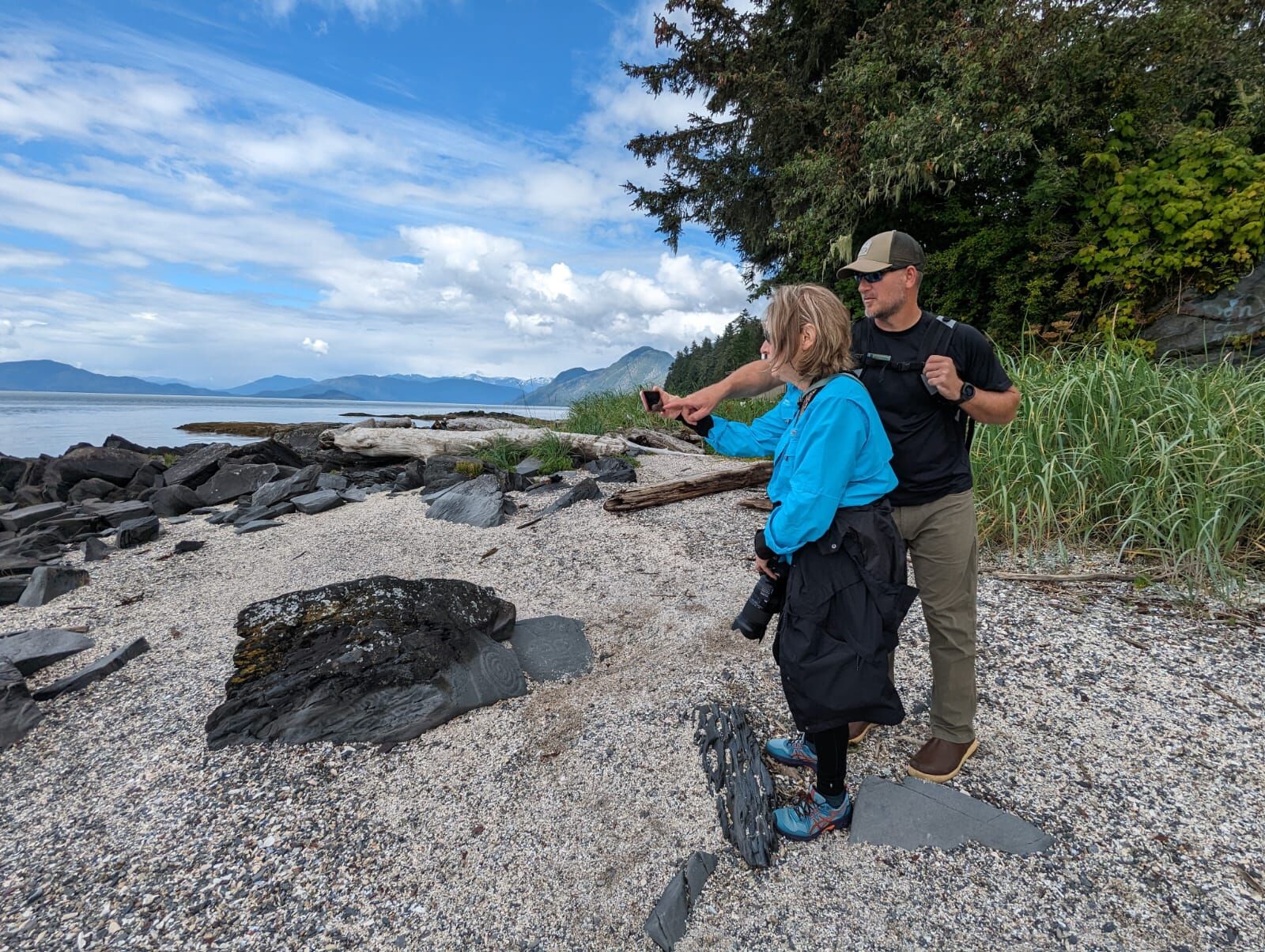 After the Wrangell Narrows, we awoke to another glaucous day at anchor outside of Wrangell, a small, relatively undisturbed town of 2,000. Fishing is still the predominant activity and income, and lovely boats speckle the harbors and horizon. At the top of the dock, we were greeted by a few of the local youth who displayed their cache of garnets for sale. Wrangell garnets are unique because there is truncation between the twelve-faceted edges. These gems are special, and Wrangell only allows local Boy Scout troops to search for and sell them, keeping them from being exploited. We were privileged enough to take a jet boat capable of navigating the shallow water of the Stikine River. Arriving at Shakes Glacier, we marveled at its differences from other glaciers we have seen. The moraines and gravel covering the ice gave a much different and enriching experience. Those of us more curious about the cultural side of things enjoyed a city tour with the highlights of Wrangell. The first stop was an intimate visit to Chief Shakes house, a replica of the Tlingit building standing on the same isthmus. A stop at the excellently curated Wrangell Museum pieced together the rich history of humans and nature and how they intertwine. The tour was finished with a walk in a local muskeg, where the naturalist described the unique flora, like the carnivorous sundew, to our curious onlookers. After another exquisite lunch back aboard the ship, there was free time in town to explore, support the locals with souvenir shopping, and an opportunity to hike to a memorable viewpoint at the top of Mt. Dewey. The day concluded with a feast of fresh Dungeness crab, bringing full circle all we had learned throughout the day.