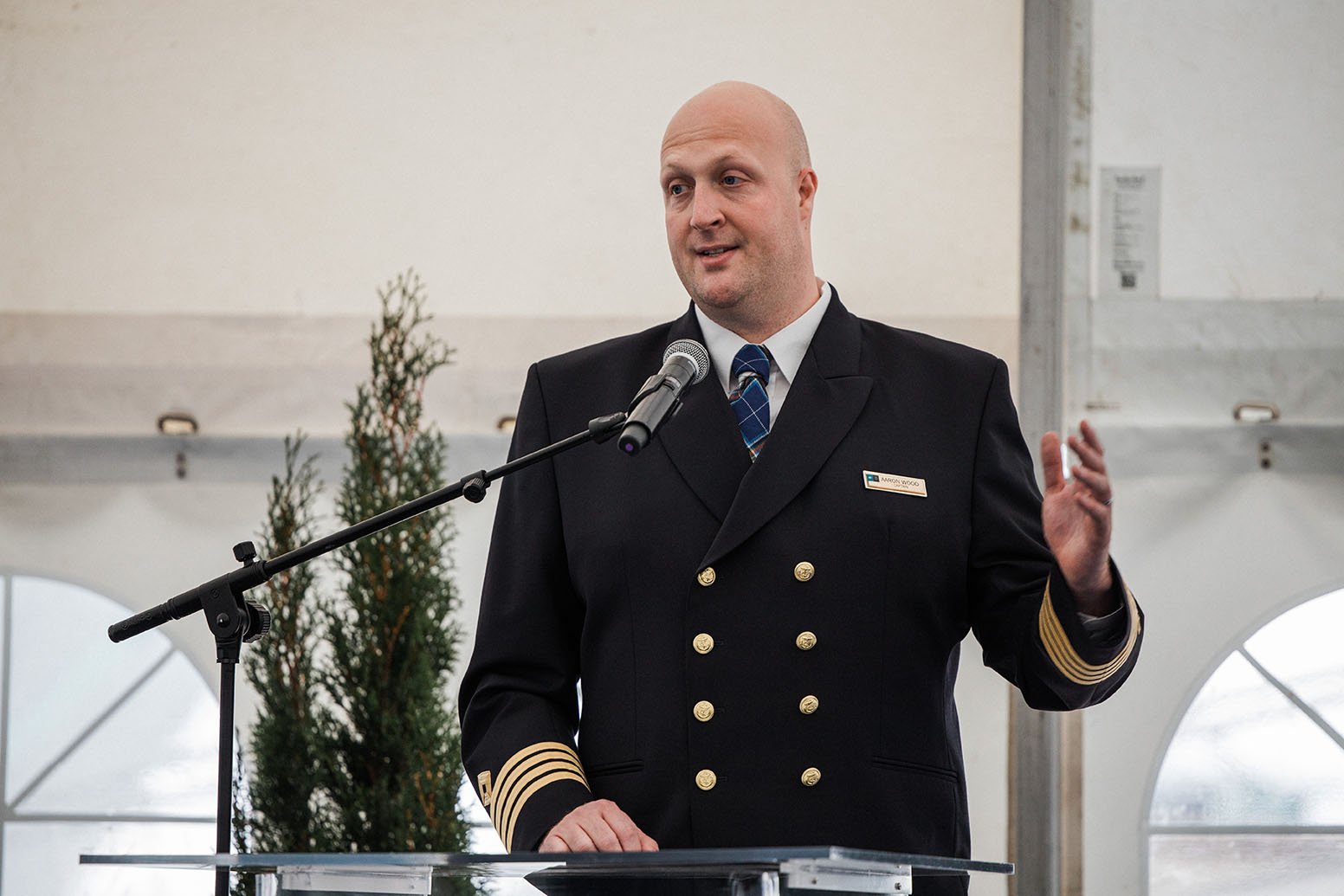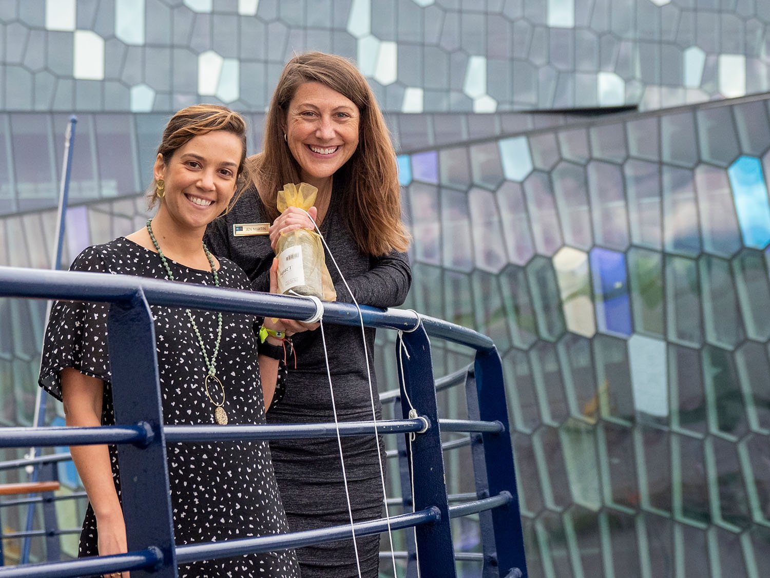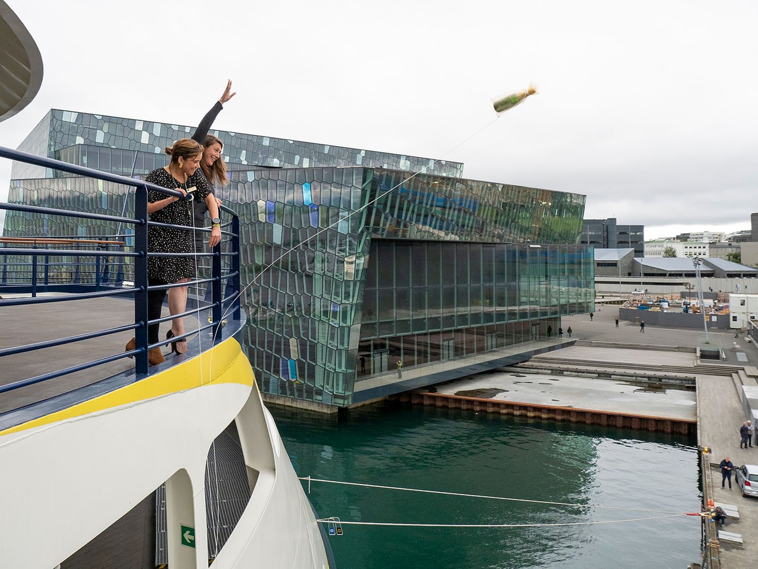 High up on National Geographic Endurance’s Bridge deck, against the backdrop of Reykjavík’s distinctive Harpa Concert Hall, Lindblad Expeditions’ Director of Field Staff & Expedition Development, Jen Martin, and Ana Esteves, Director of Hotel Operations, are ready to perform the champagne toss.