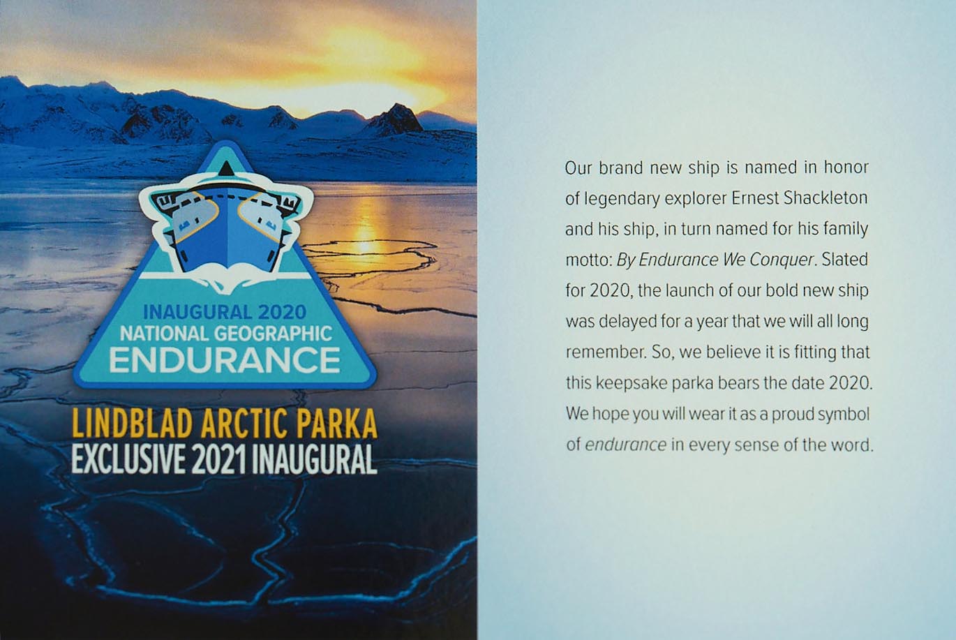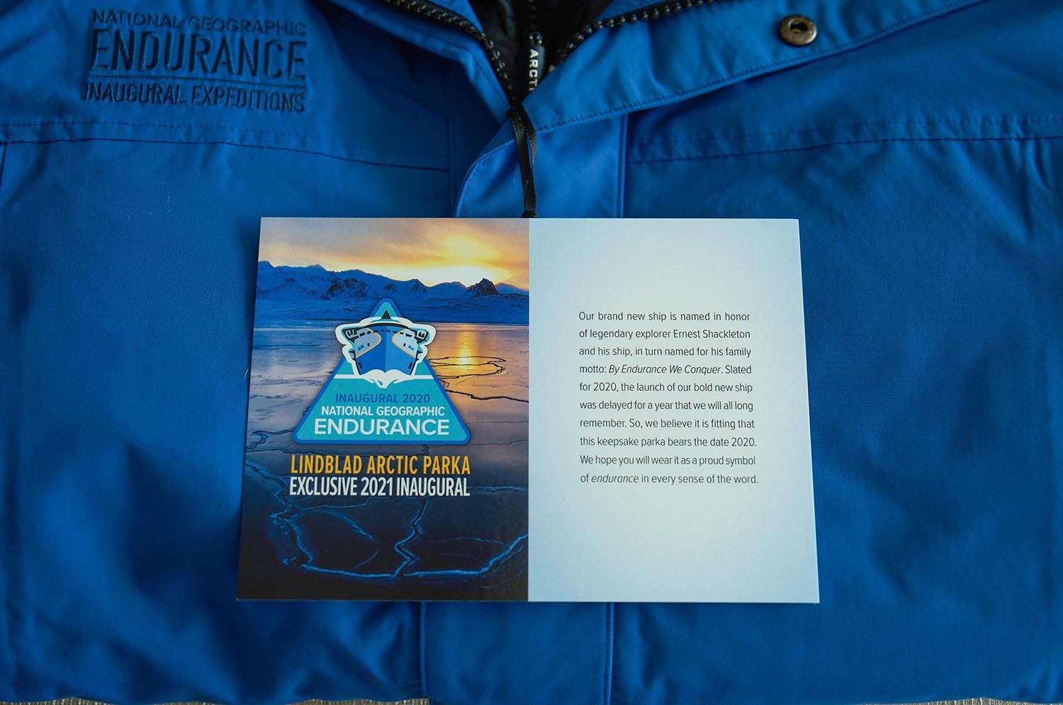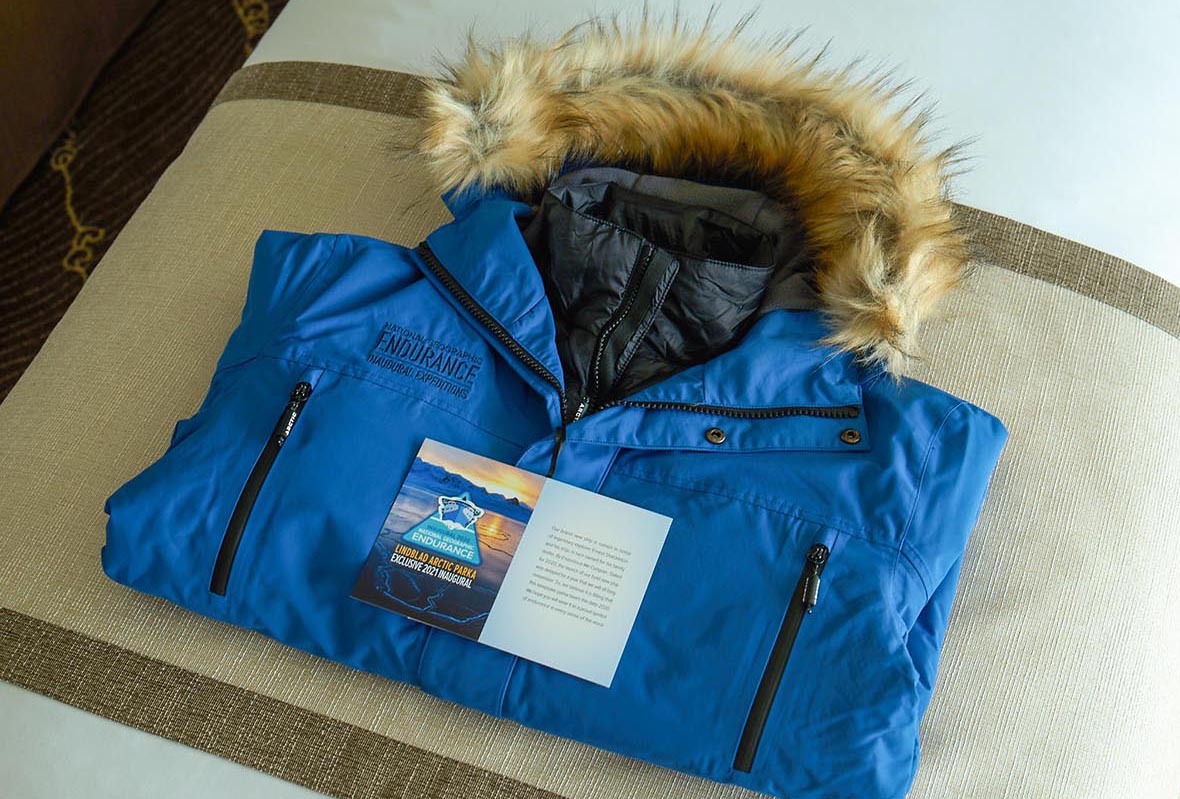 Guests entered their cabins (the first guests ever to have occupied them) to find the first-ever inaugural parka, Arctic Blue edition, waiting on their bed.