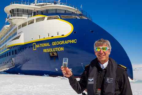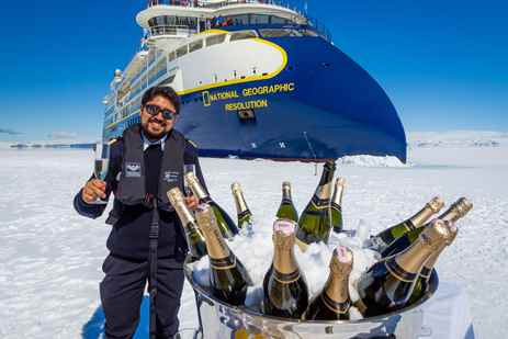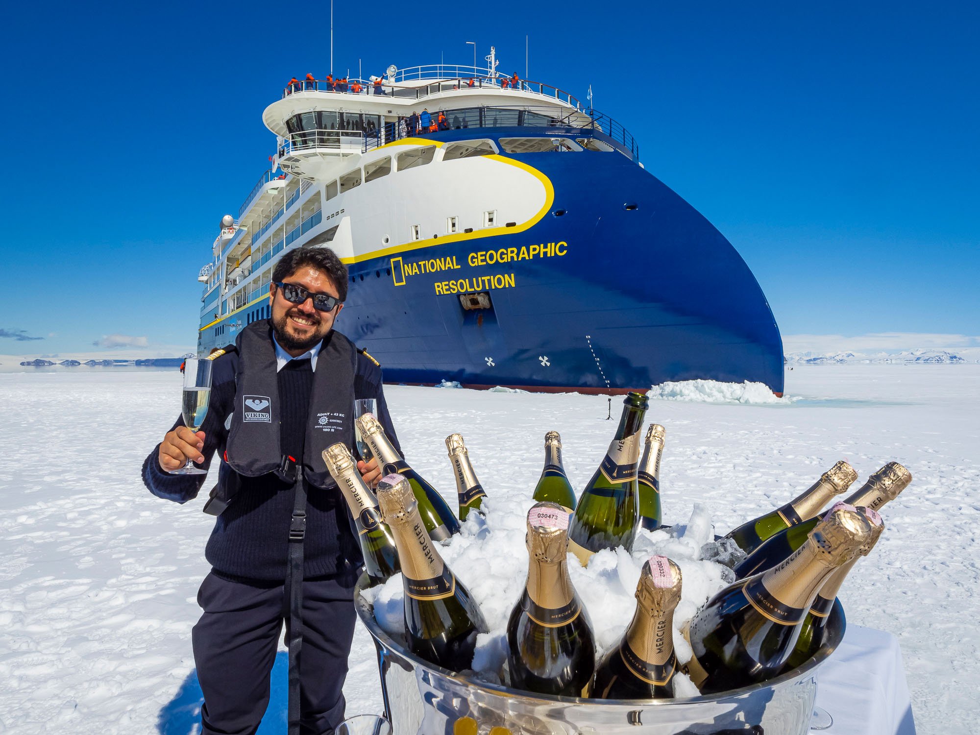 National Geographic Resolution's Hotel Manager, Sebastian Guijarro, had bottles of bubbly at the ready.