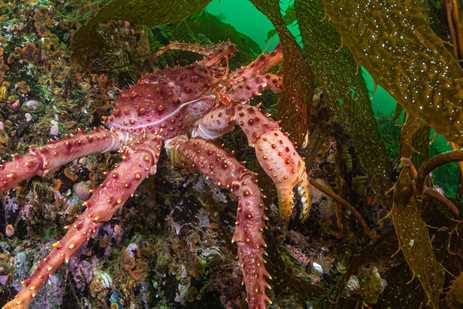 "The southern king crab (Lithodes santolla) is known locally in Patagonia as the Centolla. Related to the king crabs found in high-end seafood restaurants in the United States, Centolla crabs are the focus of fisheries in South America for the same reason. Adults usually live in deep water, up to 700 meters, however, the juveniles are much easier to find since they spend their time hiding in the intertidal zone among kelp fronds and holdfasts, eating and growing until they can survive in the ocean depths. This particular Centolla was lurking in the kelp forest, curiously investigating my camera while looking for bits of dead clams for lunch."