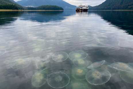 "In August of 2021, the National Geographic Venture was in Ushk Bay when we stumbled upon this enormous smack of thousands of moon jellies swimming just below the surface of the water. Besides having the coolest collective name, jellies have been around since long before the dinosaurs, they sometimes glow-in-the-dark, and one species even has the potential to be immortal. These smacktacular drifters are truly fascinating!"
