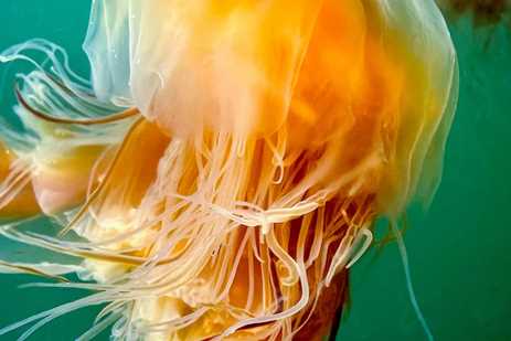 "Lion’s mane jellies (Cyanea ferruginea) are the gelatinous pride of the North Pacific. Some of the ocean’s most impressive jellyfishes, members of this genus can grow to be nearly three feet across in diameter with stinging tentacles extending over 100 feet—that’s longer than most blue whales! Associated with fjords and often washing into Southeast Alaska's harbors as juveniles, make sure you take some time to peek overboard for a chance at seeing one of the ocean’s most impressive predators, just like these two photographed with a submerged phone from the Ketchikan docks."