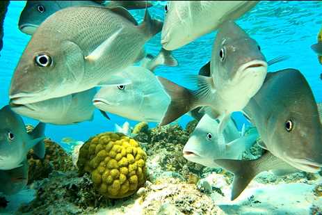 "Hovering over the shallow 15 foot reef of this stony mustard hill coral in the Bahamas, these Sailors Choice grunts were particularly curious of my camera and allowed me to get rather close. They are named for the 'grunting' sound they make which is produced by their flat teeth plates rubbing together and amplified by their air bladders. In some areas of the world, these fun fish are also known as sweetlips because, well just look at those kissers!"