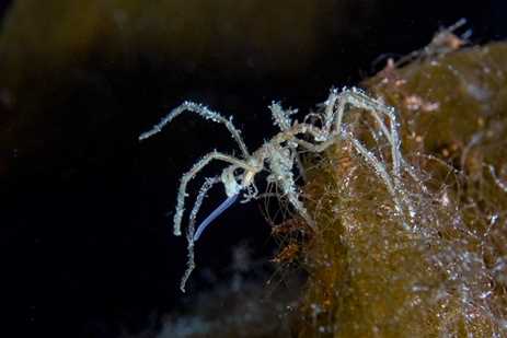 “Though commonly called sea spiders, these gorgeous benthic sea critters aren’t true spiders or even true arachnids. We often refer to them as Pycnogonids, which is their taxonomic class. On the left side of the organism (the head end!) you'll notice an appendage that looks different than the rest. This is the proboscis. The pycnogonid will jam its feeding tube proboscis into soft-bodied prey—like anemones and worms—to suck out nutritious juices. Another fun fact: some sea spider species have three moveable lips."