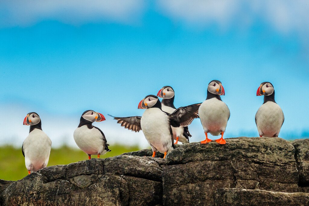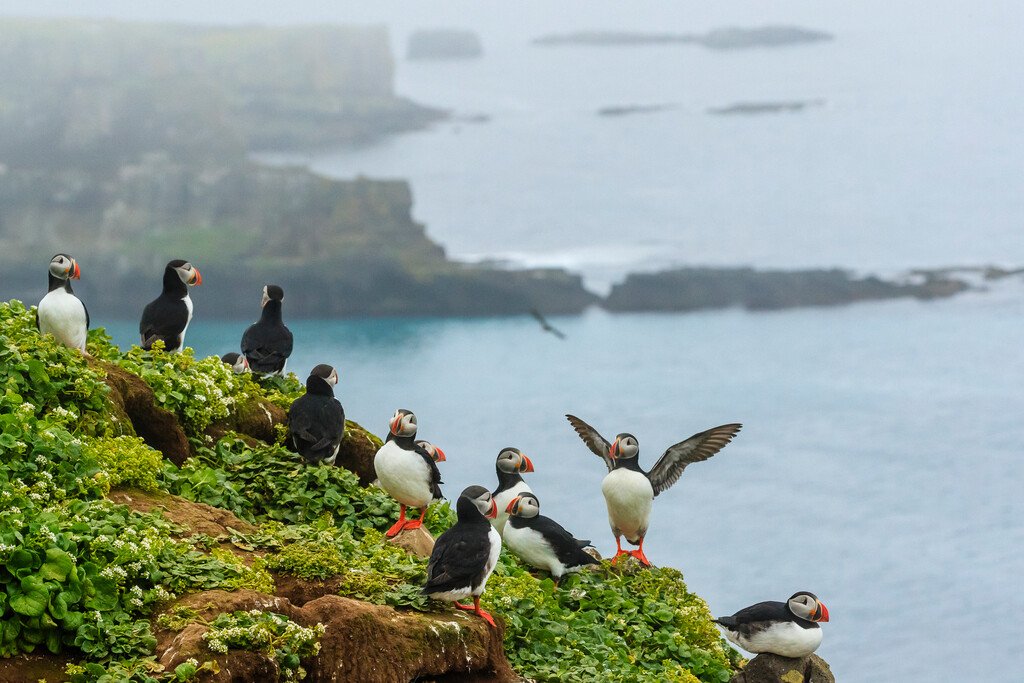 When a couple reunites for breeding season, they rub their beaks together in a heartwarming behavior known as billing. This sweet display often draws a crowd of other puffins who share in the joyful reunion.