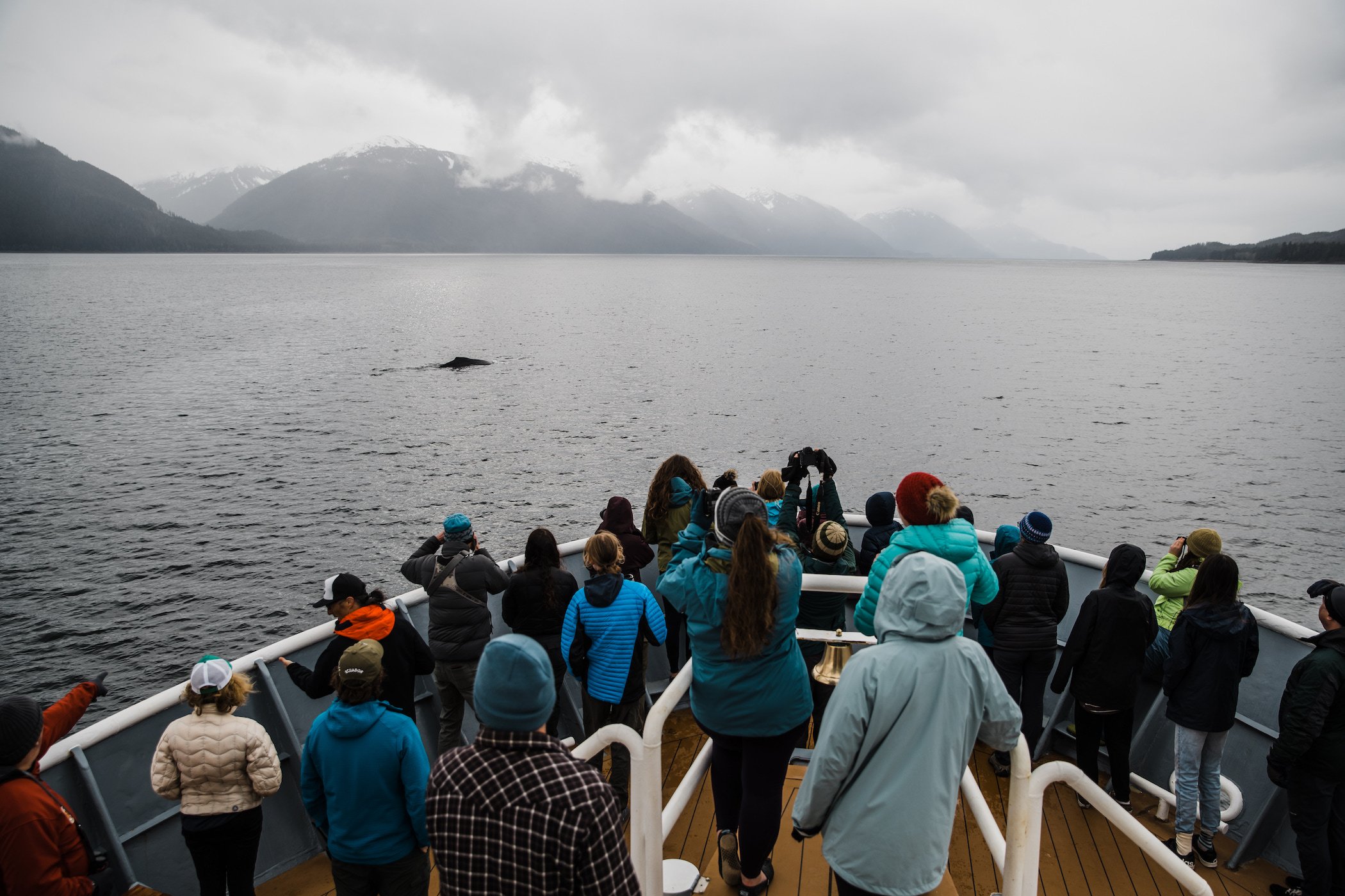 We are standing on the bow of the National Geographic Sea Lion as the sun sets over Chatham Strait in Southeast Alaska. The air is cool, the sky is lead, the water is smooth. We are surrounded by students and parents poised in anticipation. Someone points, black fins break the ocean surface in unison, and just meters away 12 orcas rise and breathe in concert. Once, twice, three times, they slip beneath the surface leaving only ripples and the misty ghost of breath drifting in the cool evening. We have been watching this cycle for the past thirty minutes. It’s like a dream. Hugs are shared, as are tears of joy.