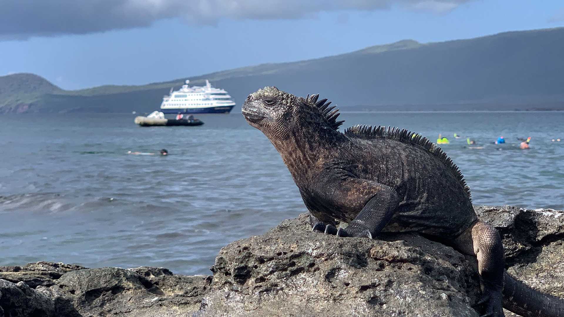 marine iguana with swimmers and ship in the background