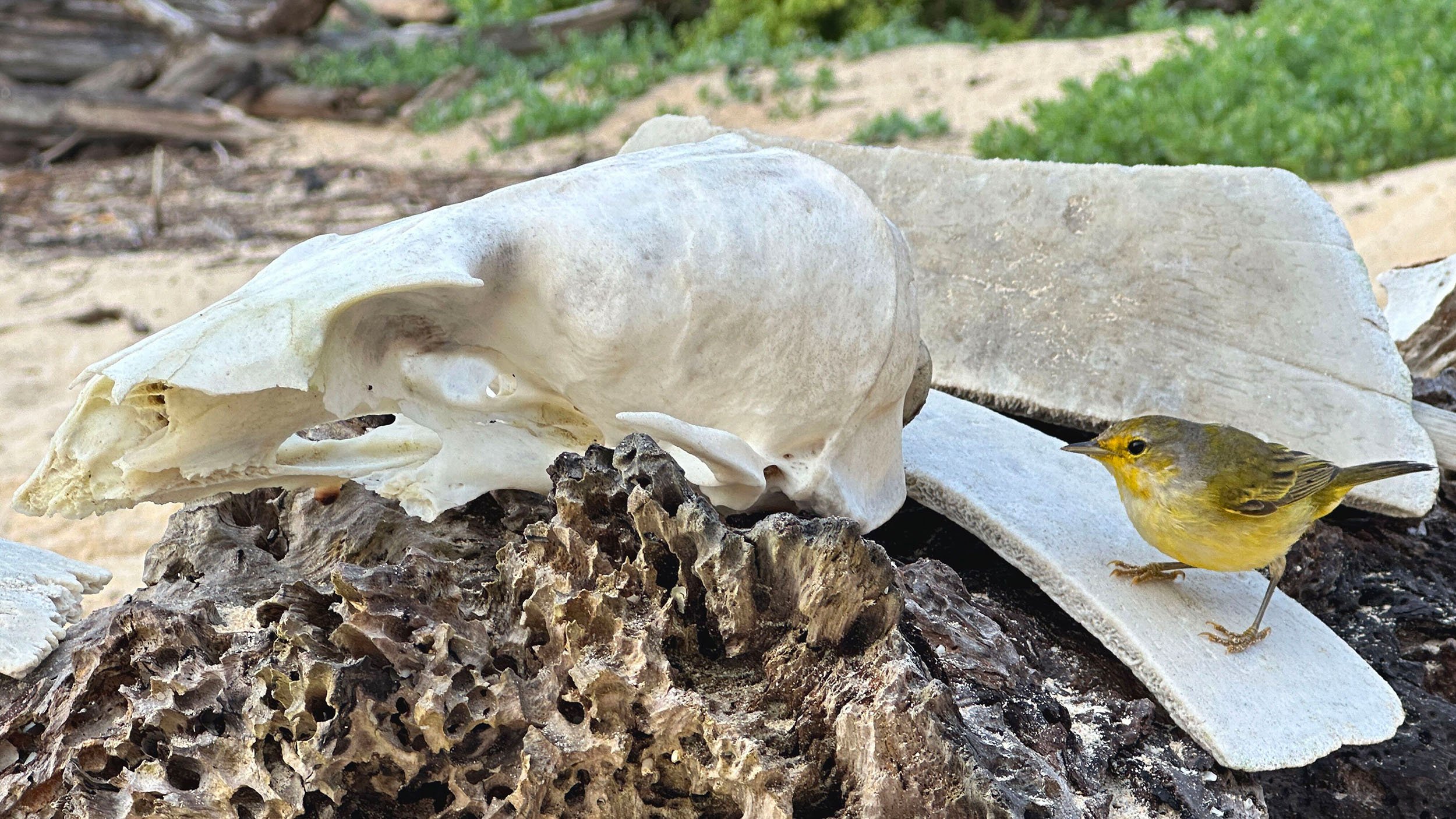 Along the coast of La Picona beach at Punta Cormorant, there was a female yellow warbler looking for some insects. She finally found several flies and was actively catching them from some debris brought by the marine currents to the shore. —Gilda Gonzalez, Naturalist
