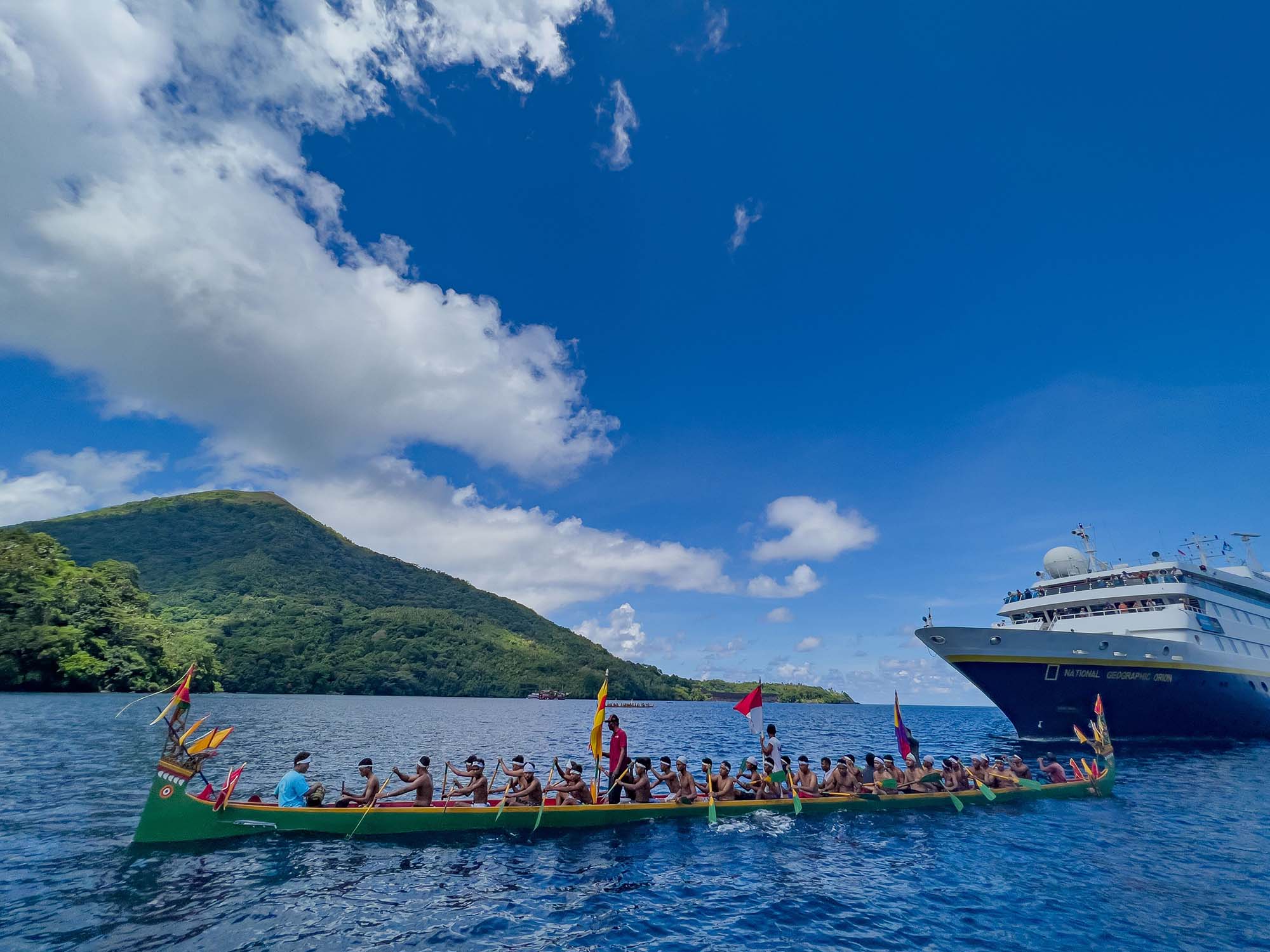As we arrived below a conical volcanic peak and approached the spectacular Banda Islands, two traditional canoes greeted us with a warm welcome ceremony. —Mike Greenfelder, Naturalist/Certified Photo Instructor